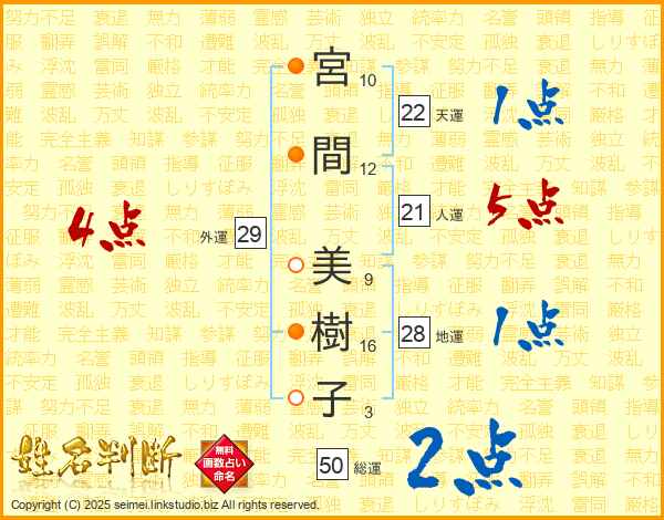 宮間美樹子さんの外運は29画の4点!