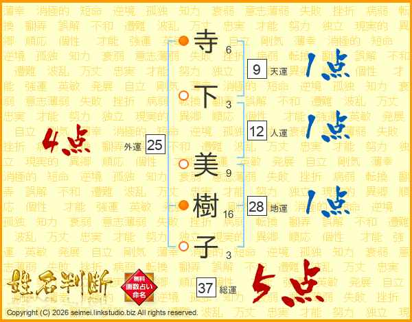 寺(6画)下(3画) 美(9画)樹(16画)子(3画)