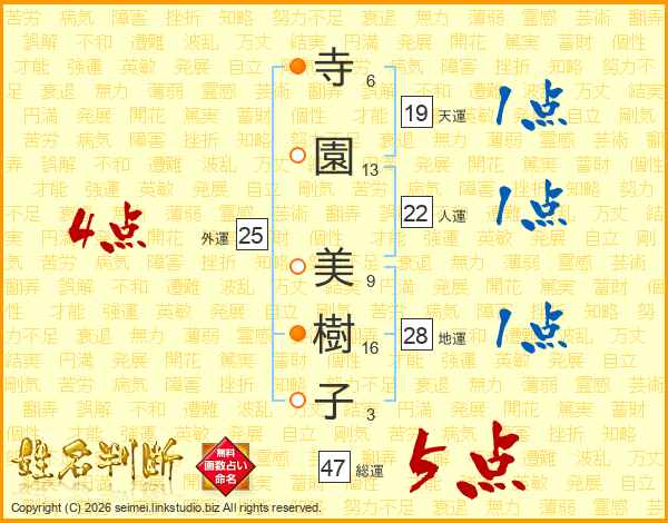 寺(6画)園(13画) 美(9画)樹(16画)子(3画)