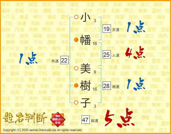 小(3画)幡(16画) 美(9画)樹(16画)子(3画)