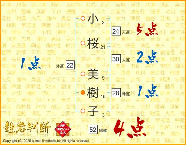 小桜美樹子さんの総運は52画の4点!