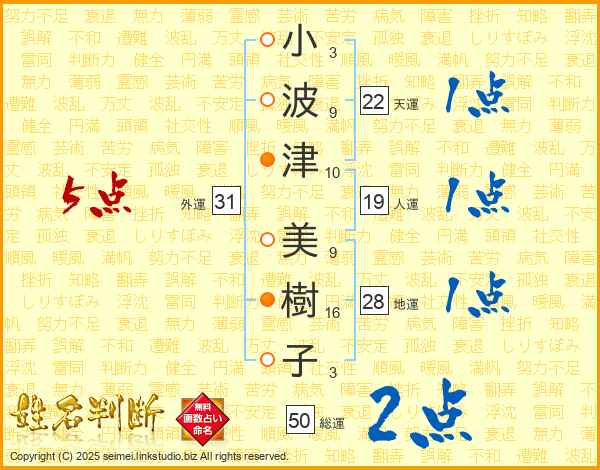 小(3画)波(9画)津(10画) 美(9画)樹(16画)子(3画)