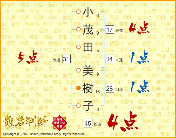 小(3画)茂(9画)田(5画)  美(9画)樹(16画)子(3画)