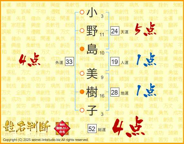 小野島美樹子さんの総運は52画の4点!