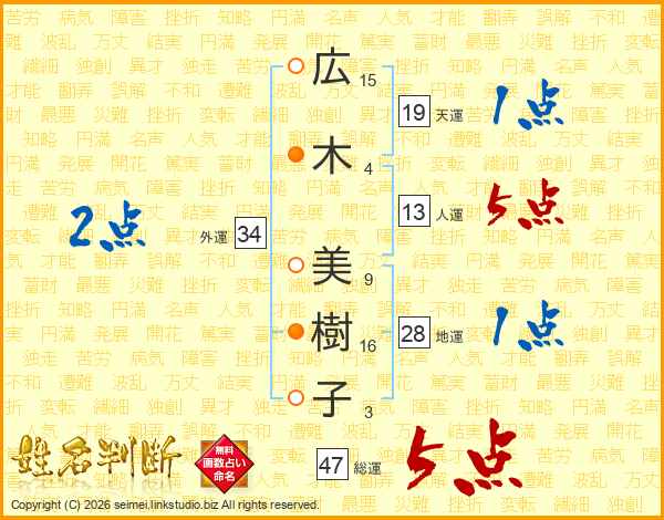 広(15画)木(4画) 美(9画)樹(16画)子(3画)
