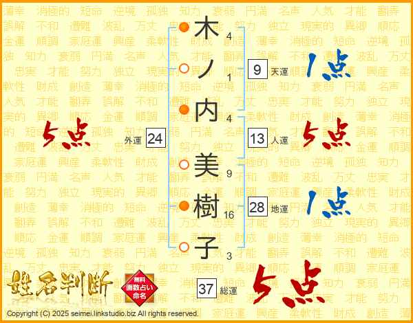 木(4画)ノ(1画)内(4画) 美(9画)樹(16画)子(3画)
