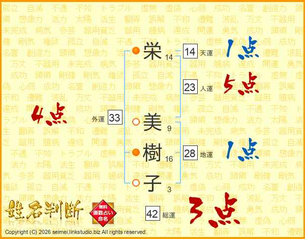 栄(14画) 美(9画)樹(16画)子(3画)