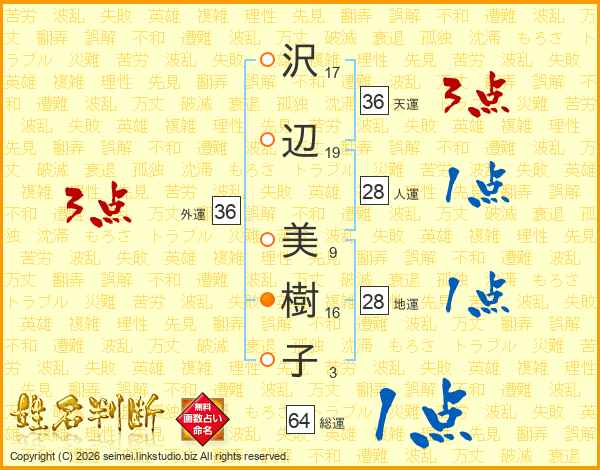 沢(17画)辺(19画) 美(9画)樹(16画)子(3画)