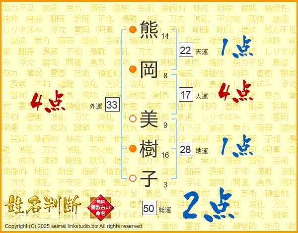 熊(14画)岡(8画) 美(9画)樹(16画)子(3画)