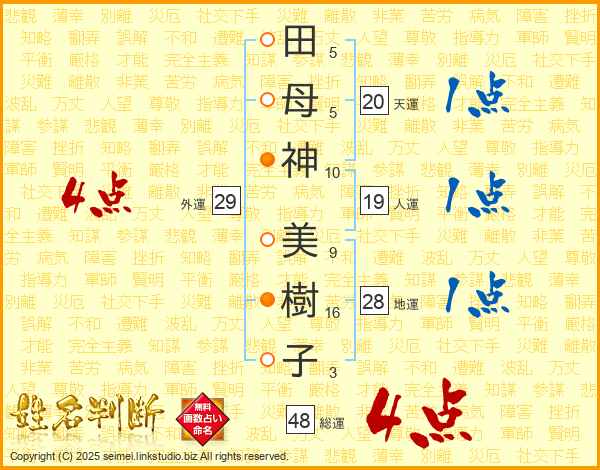 田(5画)母(5画)神(10画) 美(9画)樹(16画)子(3画)