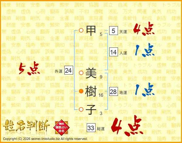 甲美樹子さんの総運は33画の4点!