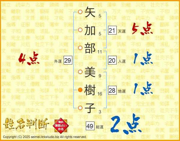 矢(5画)加(5画)部(11画) 美(9画)樹(16画)子(3画)