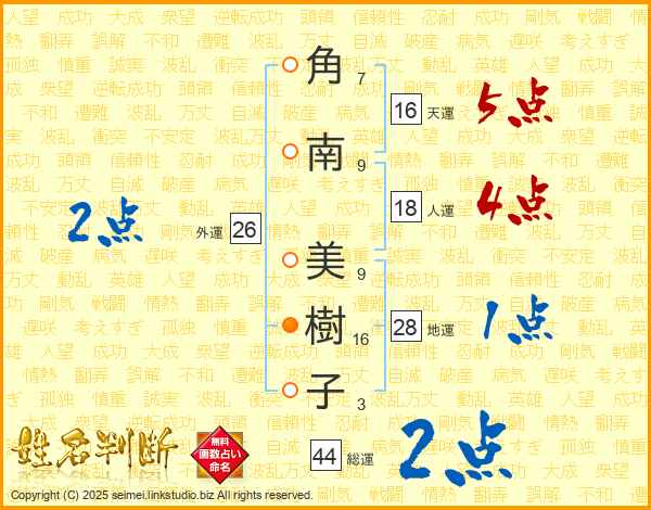 角(7画)南(9画) 美(9画)樹(16画)子(3画)