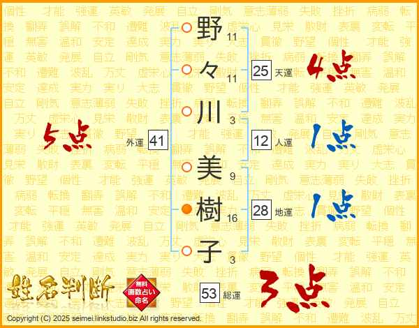 野(11画)々(11画)川(3画) 美(9画)樹(16画)子(3画)