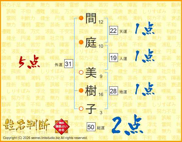 間(12画)庭(10画) 美(9画)樹(16画)子(3画)