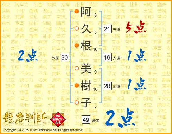 阿(8画)久(3画)根(10画) 美(9画)樹(16画)子(3画)