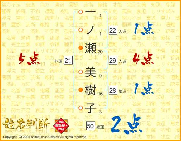 一(1画)ノ(1画)瀬(20画) 美(9画)樹(16画)子(3画)