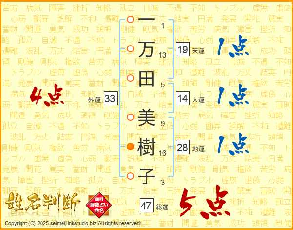 一(1画)万(13画)田(5画) 美(9画)樹(16画)子(3画)