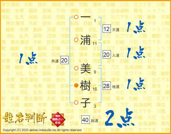 一(1画)浦(11画) 美(9画)樹(16画)子(3画)