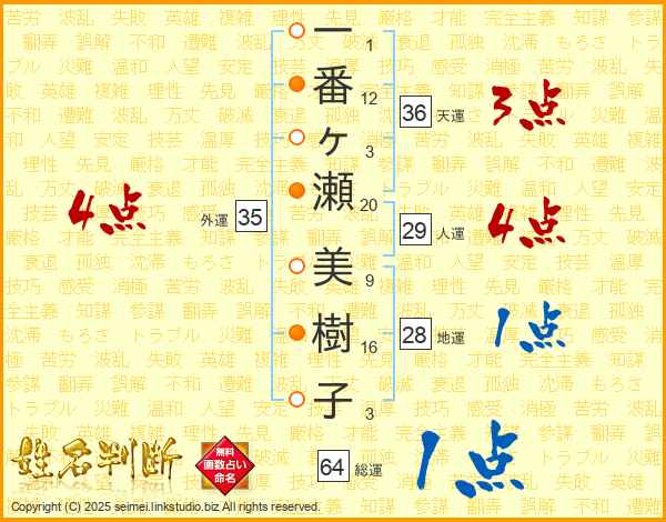 一番ヶ瀬美樹子さんの総運は64画の1点!
