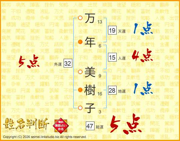 万(13画)年(6画) 美(9画)樹(16画)子(3画)