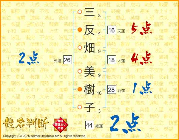 三(3画)反(4画)畑(9画) 美(9画)樹(16画)子(3画)
