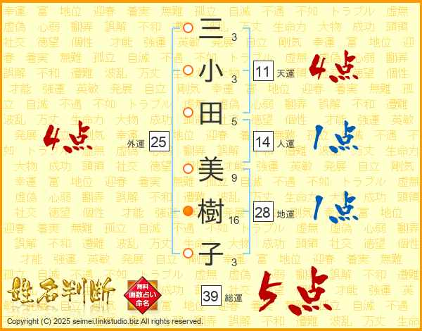 三(3画)小(3画)田(5画) 美(9画)樹(16画)子(3画)