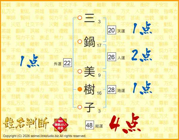 三(3画)鍋(17画) 美(9画)樹(16画)子(3画)