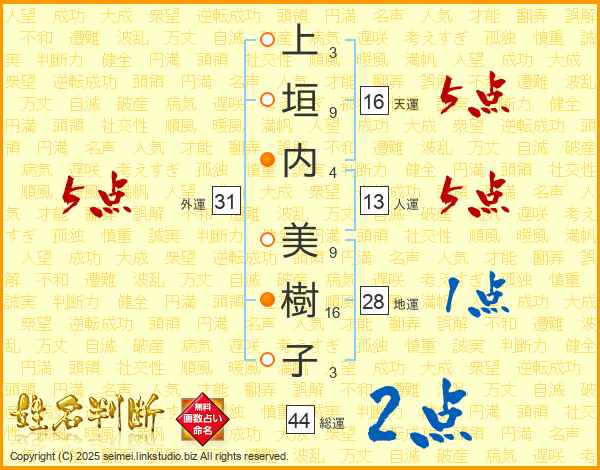 上(3画)垣(9画)内(4画) 美(9画)樹(16画)子(3画)