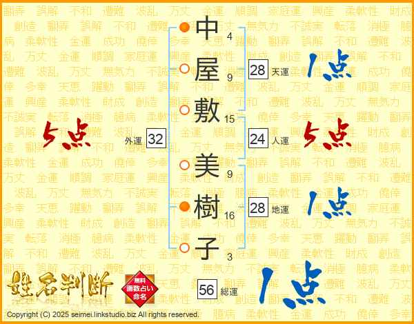 中(4画)屋(9画)敷(15画)  美(9画)樹(16画)子(3画)