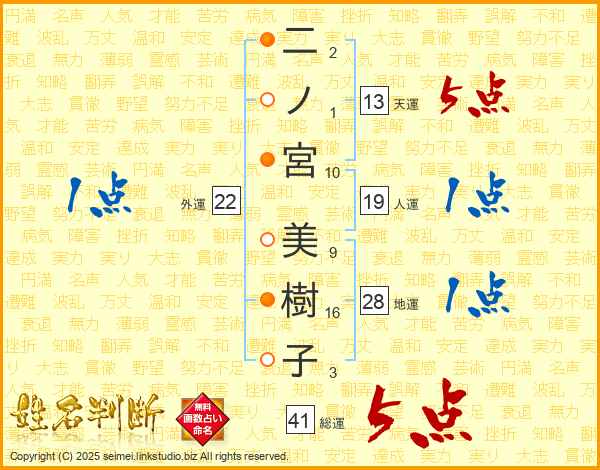 二(2画)ノ(1画)宮(10画) 美(9画)樹(16画)子(3画)