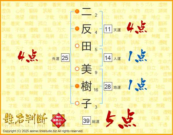 二(2画)反(4画)田(5画) 美(9画)樹(16画)子(3画)