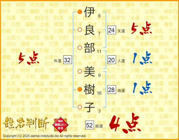 伊(6画)良(7画)部(11画) 美(9画)樹(16画)子(3画)