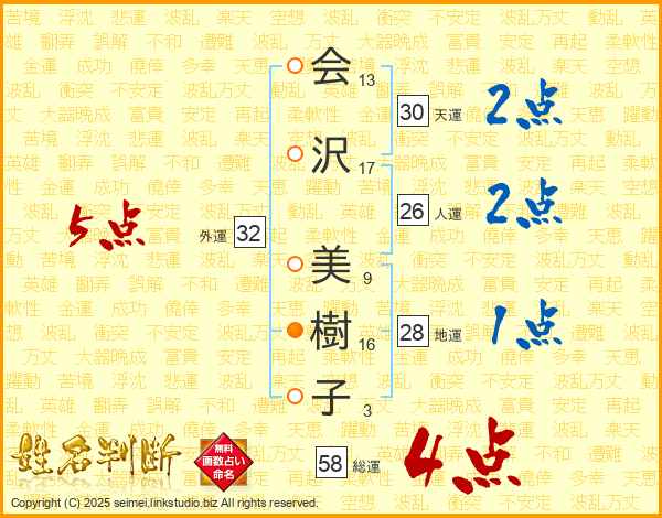 会(13画)沢(17画) 美(9画)樹(16画)子(3画)