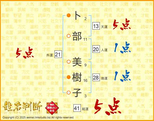 卜(2画)部(11画) 美(9画)樹(16画)子(3画)