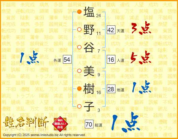 塩(24画)野(11画)谷(7画) 美(9画)樹(16画)子(3画)