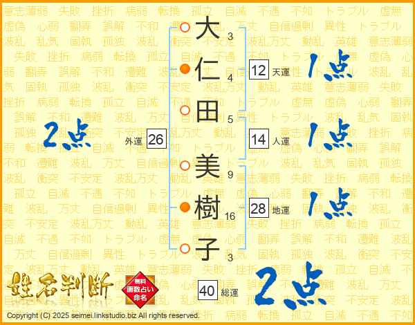 大(3画)仁(4画)田(5画) 美(9画)樹(16画)子(3画)