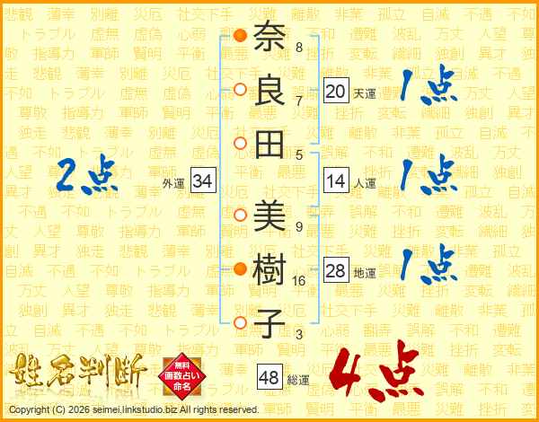 奈(8画)良(7画)田(5画) 美(9画)樹(16画)子(3画)