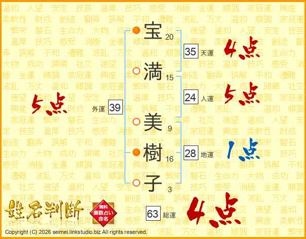 宝(20画)満(15画) 美(9画)樹(16画)子(3画)