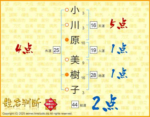 小(3画)川(3画)原(10画)  美(9画)樹(16画)子(3画)