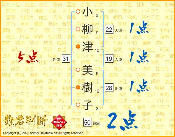 小(3画)柳(9画)津(10画) 美(9画)樹(16画)子(3画)