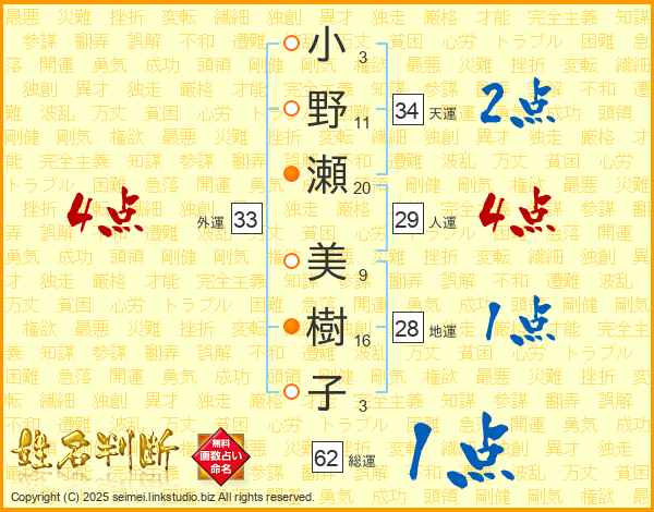小(3画)野(11画)瀬(20画) 美(9画)樹(16画)子(3画)