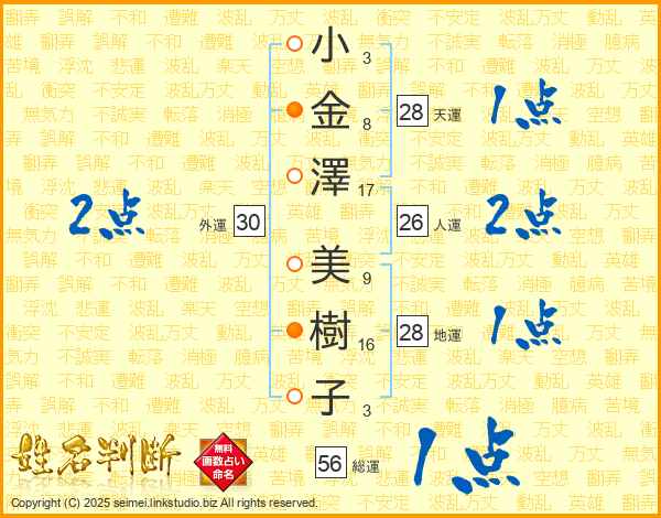 小(3画)金(8画)澤(17画) 美(9画)樹(16画)子(3画)