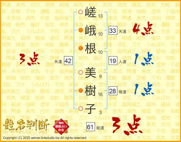 嵯(13画)峨(10画)根(10画) 美(9画)樹(16画)子(3画)