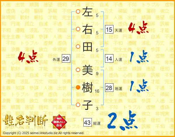 左(5画)右(5画)田(5画) 美(9画)樹(16画)子(3画)