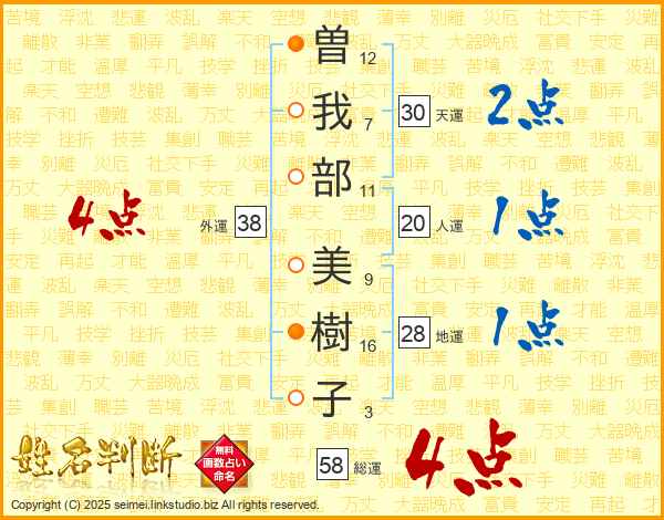 曽(12画)我(7画)部(11画) 美(9画)樹(16画)子(3画)