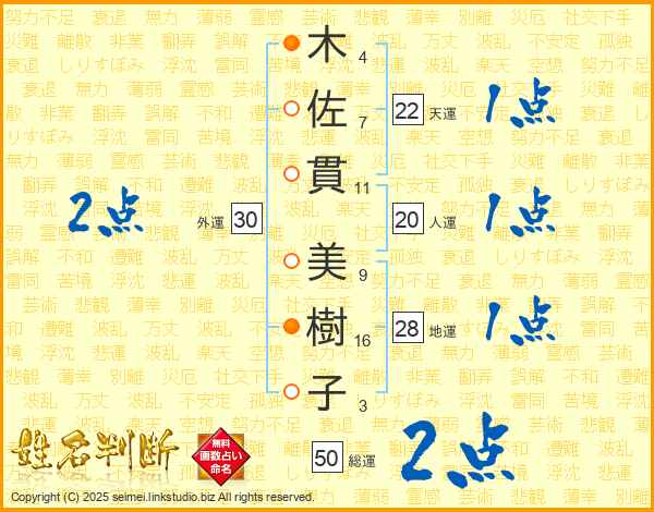 木(4画)佐(7画)貫(11画) 美(9画)樹(16画)子(3画)