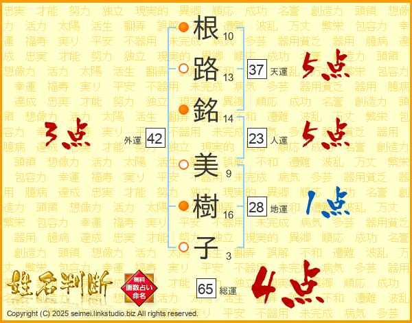 根(10画)路(13画)銘(14画) 美(9画)樹(16画)子(3画)