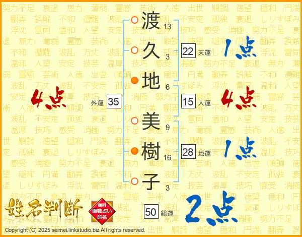 渡(13画)久(3画)地(6画) 美(9画)樹(16画)子(3画)