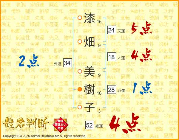 漆畑美樹子さんの総運は52画の4点!